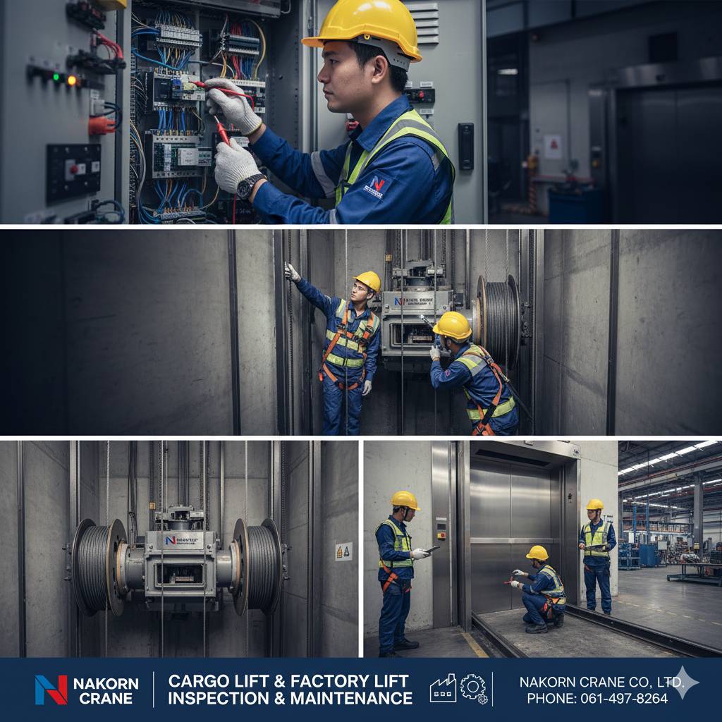 รวมถึงการตรวจสอบชิ้นส่วนสำคัญ เช่น มอเตอร์ รอก สลิง ระบบไฟฟ้า และระบบเบรก